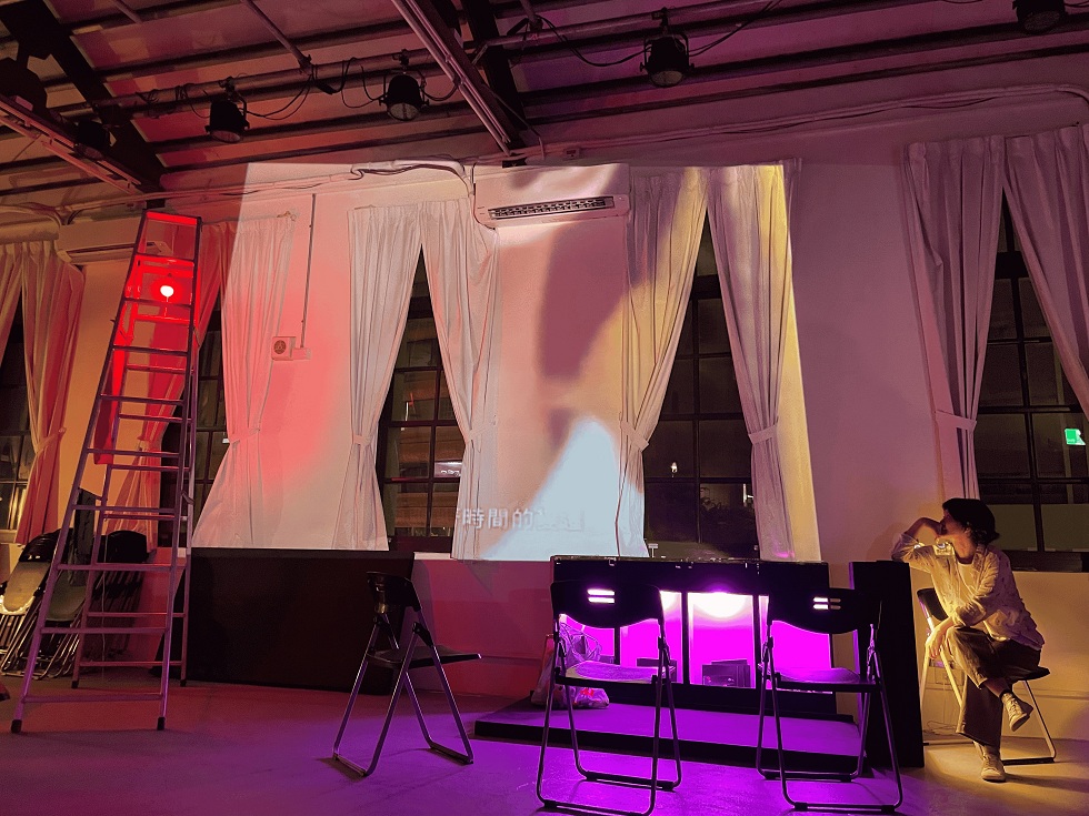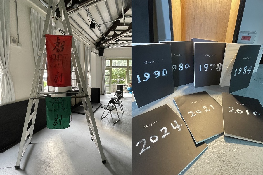 平常當作觀眾席使用的黑色木箱被分解開來,長棺一般,三三兩兩分布在幾個角落,載放黑皮筆記本。劇場常見的鋁製A梯上方,懸掛著兩塊卓明參與過的戲劇研習營旗布。殘缺破碎的影片投映在後方的牆上、白色窗簾。工作坊見過的紙箱還保持原始模樣,放在臨陽台的窗前長椅上,面向對街的郵政博物館。彷彿還是建構中的工地,模糊的音檔,斷裂的影像,標記年份但沒有被寫滿的筆記本,還在邀請行動者續上。